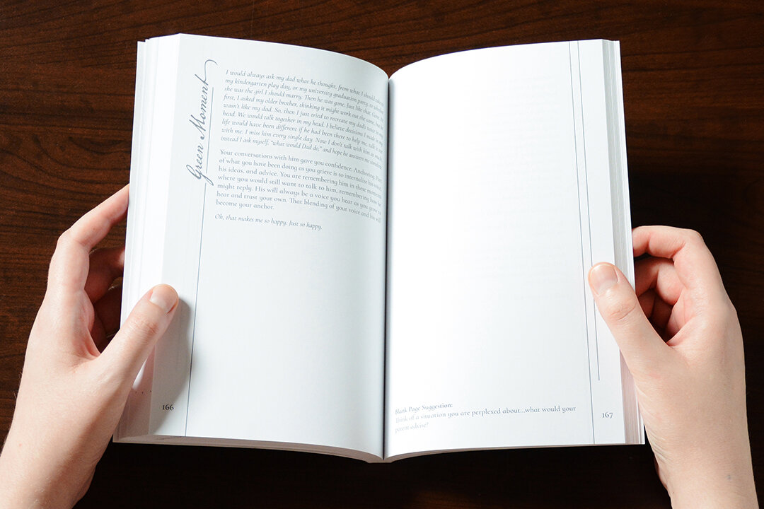 The book weaves "Moments" (written in first person, like a personal diary entry of the griever's thoughts and feelings) into a spectrum of six colours, as a road map forward. Each "Moment” has a companion response of support which could be a friend, family member, colleague or therapist. There are blank pages for expression and journaling, allowing you to document your own grief journey.